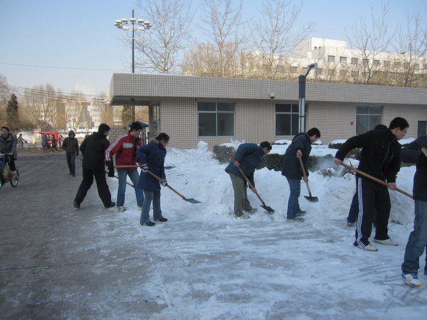 此次活動主要分三個方位同時進行掃雪,即科研樓東側的停車場、中心停車場與三教東側的停車場。大家熱情高漲,積極參與鏟雪活動。30把鐵锨、84顆火熱的心,在午后的停車場舞動起來。有用鐵楸鏟的、有用掃把掃的、有用長鍬堆的,老師及同學們用自己的熱情在揮撒著一份份愛心。更讓人感動的是,有不少自發的人群也積極加入掃雪的隊伍中來。一位素不相識的留學生,了解情況后,二話沒說就挽起袖子開始進行掃雪。經過近三個小時的奮戰,南校區停車場上的積雪基本上被清掃完畢。