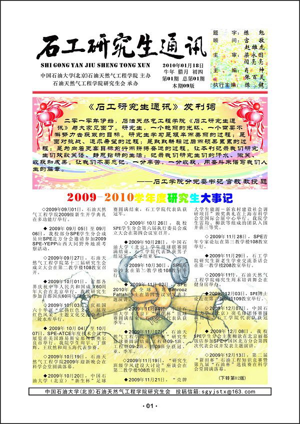 中國石油大學(北京)石油天然氣工程學院首份研究生電子期刊《石工研究生通訊》于2010年1月18日正式發刊。石工學院院長陳勉教授為本刊題字,石工學院分黨委書記宮敬教授為本刊撰寫發刊詞。
