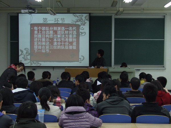 比賽分為初賽和復賽兩個環節,由每班選派五人,共組成充滿活力的七支隊伍參賽。初賽中各組隨機抽取題目,并針對抽中的命題策劃設計創意營銷方案。各組選手八仙過海,各顯其能,展現形式多種多樣,語言風趣幽默,構思巧妙新奇,將“向奧巴馬推銷豆汁”,“租個盒子來創業”,“沙漠火鍋”,“推銷功能性蠟燭”等營銷命題演繹得精彩紛呈。決賽環節中,初賽勝出的三個小組針對固定命題––“一個被咬過的蘋果”進行現場營銷,以發散的思維和科幻的視角,給人耳目一新的感覺,配以評委嘉賓的精彩點評,將競賽的氣氛推向高潮。