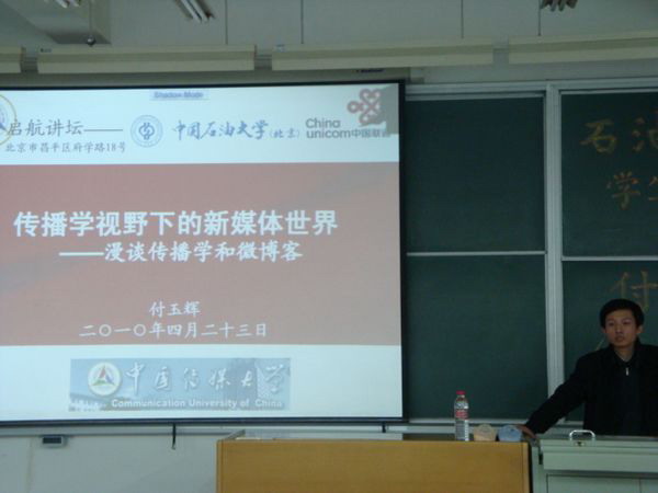 付博士講述了自己近幾年的求學(xué)及工作經(jīng)歷,并從專業(yè)角度分析了石油行業(yè)的發(fā)展與傳播學(xué)的聯(lián)系,引起了到場(chǎng)同學(xué)的極大興趣。他通過目前比較時(shí)尚的新浪微博上諸多有關(guān)時(shí)事問題的帖子,向在場(chǎng)同學(xué)們展示了社會(huì)的另一面;還通過一些明星的微博說明了傳播學(xué)在人們生活中的普遍性。