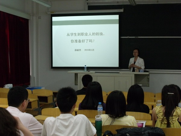 5月21日下午,石油大學工商管理學院在二教102教室舉辦了“陽光職場”系列講座。本期講座邀請到曾任佐佑人力資源顧問公司業務總監的薛毅然女士作為主講嘉賓,為同學們帶來了一場名為“從學生到職業人轉變”的講座。