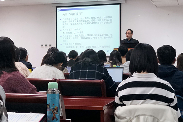 田海龍介紹了科研項目的定義與特征,結合生活事例重點闡述了科研項目申報書的寫作原則,并對學院科研項目團隊成員的項目申報書進行了指導。