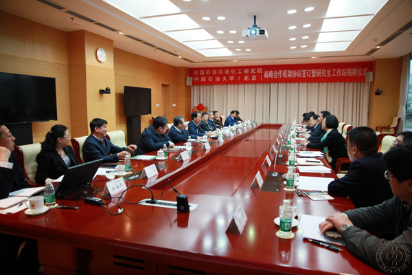 中國石油總工程師兼石油化工研究院院長藺愛國,石油化工研究院黨委書記、副院長何盛寶,副院長胡杰、高雄厚等企業(yè)領(lǐng)導(dǎo)接待了蔣慶哲和張來斌一行,并陪同參觀了石油化工研究院分析檢測(cè)、催化劑載體制備、催化劑評(píng)價(jià)等院部研究室。吳小林和高雄厚分別代表雙方簽訂了共同建立“研究生聯(lián)合培養(yǎng)基地”的協(xié)議;張來斌和藺愛國分別代表雙方簽訂了戰(zhàn)略合作框架協(xié)議,并為研究生工作站揭牌。
