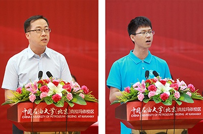 克拉瑪依校區石油學院教授殷文作為教師代表發言,他說,歡迎同學們成為校區的一員,未來的幾年老師們將與同學們攜手前行,共同度過,希望同學們通過自己的刻苦努力,能夠成長、成熟,無悔這段美好的大學時光。工學院過程裝備與控制工程專業學生王煜欽作為新生代表發言,他說,中國石油大學克拉瑪依校區的首屆新生將以堅韌毅力面對困難,以不凡實力面對挑戰,以謙虛之志面對成功,以豁達之心笑對失敗。