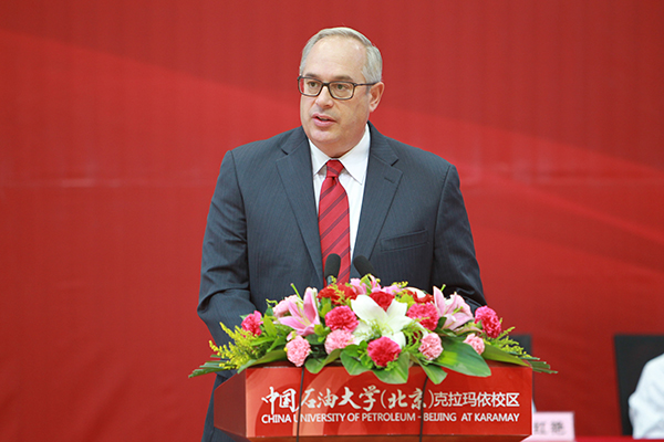 美國塔爾薩大學校長杰拉德·克蘭西致辭說,中國石油大學與塔爾薩大學已有多年的合作歷史,雙方都在過去的合作中受益,克拉瑪依校區的建設為雙方提供了新的合作機會,希望今后塔爾薩大學能為中國石油大學的教學和科研發展出一份力,錦上添花。