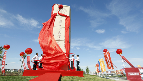 教育部副部長、黨組成員朱之文,新疆維吾爾自治區黨委常委、副主席艾爾肯·吐尼亞孜,克拉瑪依市委書記、市人大常委會主任、新疆油田公司黨委書記、副總經理陳新發,中國石油大學(北京)校長張來斌共同為校區校牌揭幕。鮮艷的紅綢緩緩落下,刻有中國石油大學(北京)克拉瑪依校區校名和校徽的石質校牌在陽光下熠熠生輝。