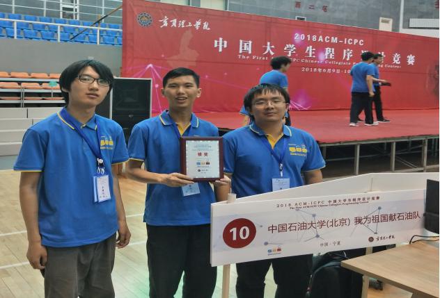 近日,2018年ACM-ICPC中國大學生程序設計競賽在寧夏理工學院舉行。石大地球物理與信息工程學院2016級本科生呂博楓、馮云豪、李昊元組成的“我為祖國獻石油”隊與2017級本科生許思睿、連浩丞、高宇翔組成的“我為石油獻代碼”隊分別獲得大賽銀牌和銅牌,指導教師為地球物理與信息工程學院計算機系范江波。