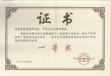 6月25日,北京高校黨建研究會(huì)成立30周年紀(jì)念大會(huì)暨北京高校黨建工作論壇在清華大學(xué)召開(kāi)。會(huì)上宣讀了全國(guó)黨的建設(shè)研究會(huì)《關(guān)于表彰全國(guó)黨建研究會(huì)2017年度調(diào)研課題優(yōu)秀成果的決定》(全黨研文〔2018〕1號(hào)),中國(guó)石油大學(xué)研究成果《新形勢(shì)下高校進(jìn)一步從嚴(yán)管理監(jiān)督干部的重點(diǎn)難點(diǎn)研究》獲得一等獎(jiǎng)。
