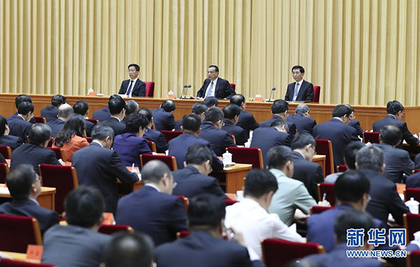李克強(qiáng)在會(huì)上講話。汪洋、王滬寧、趙樂(lè)際、韓正出席會(huì)議。