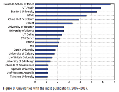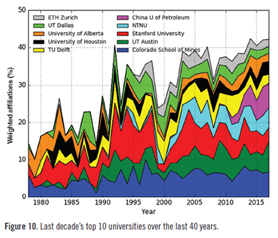 根據該文統計,多年來,中國石油大學在《地球物理學》期刊上發表論文的數量一直位居前列。其中,2007-2017年期間,石大發表的論文數量位居世界第五位,體現了學校在地球物理學研究領域的優勢和持續發展。