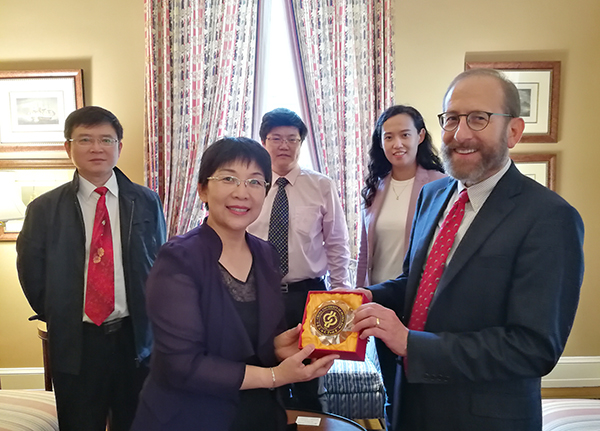 黨委書記山紅紅向哈佛大學教務長艾倫·嘉伯(Alan Garber)贈送石大紀念品