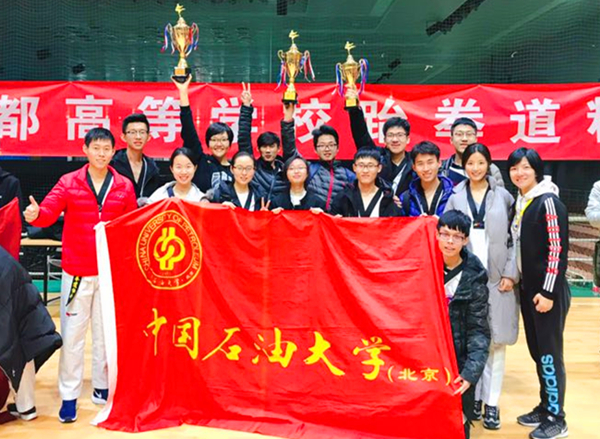 11月4日,由北京市大學生體育協會跆拳道分會主辦的“2018年首都高等學校跆拳道精英賽”在北京科技大學舉辦,石大代表隊29人參賽,榮獲乙組團體總分第三名,女子團體第二名,男子團體第四名,運動員楊庚明獲女子競技73kg項目第一名,孫德欣獲男子個人品勢項目第二名,曹艷靜等9人分獲5個項目第三名,任玉坤獲得“優秀運動員”稱號。
