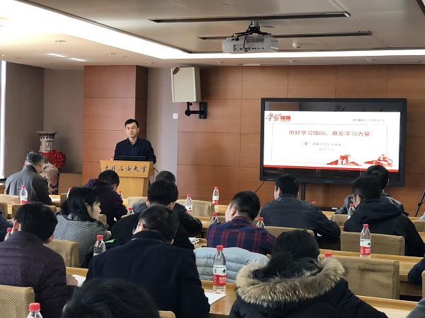 3月21日,由石大機(jī)關(guān)黨委主辦、宣傳部黨支部承辦的第七期“午間文化沙龍”活動在主樓A1402會議室舉行。黨委宣傳部副部長張延港作了題為“用好‘學(xué)習(xí)強(qiáng)國’、激發(fā)學(xué)習(xí)力量”的專題講座,70余名機(jī)關(guān)黨員干部參加活動。活動由機(jī)關(guān)黨委書記趙慶海主持。