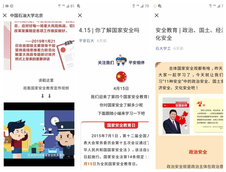 國家安全是安邦定國的重要基石,為深入學習貫徹習近平新時代中國特色社會主義思想,切實增強學校師生國家安全意識,在第四個“全民國家安全教育日”到來之際,中國石油大學黨委宣傳部、學生工作部、保衛處、信息中心等聯合開展了“國家安全 護航有我”系列主題教育活動。