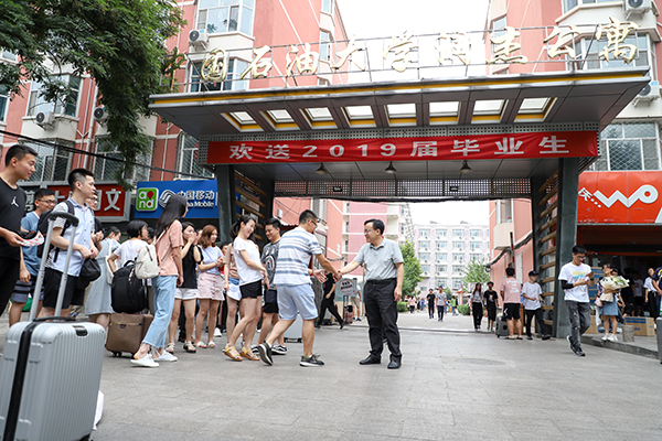 為歡送2019屆畢業生安全、文明、有序離校,6月26日至29日,中國石油大學黨政辦公室、學生工作部(處)和研究生工作部聯合開展了2019屆畢業生離校送站工作。校長張來斌,黨委副書記、副校長韓尚峰,相關職能部門負責人來到潤杰學生公寓西門,為即將告別母校、踏上人生新征程的石大學子送上親切的問候和深深的祝福。