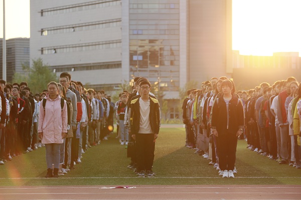 清晨八點半整,迎著初升的朝陽,升國旗儀式正式開始。國旗儀仗隊邁著整齊劃一的步伐護送五星紅旗。隨著莊嚴的國歌聲奏起,全體師生目矚國旗冉冉升起,一同高唱國歌,鮮艷的五星紅旗迎風飄揚,在陽光下熠熠生輝。