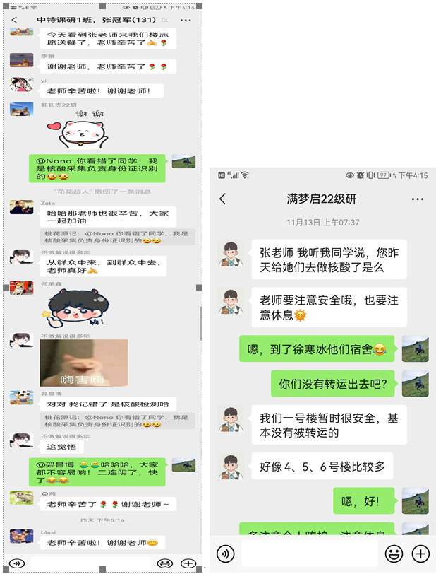第一天核酸采樣工作辛苦的同時(shí),也讓張老師感到了巨大的欣慰和鼓舞。采樣至四層某個(gè)宿舍時(shí),忽然聽(tīng)到開(kāi)房門(mén)做核酸的學(xué)生說(shuō)了句“謝謝張老師!張老師辛苦了!”張老師一時(shí)沒(méi)反應(yīng)過(guò)來(lái),心想:這一身打扮,照著鏡子都認(rèn)不出自己,這孩子怎么認(rèn)出我的??接著又是四五個(gè)宿舍的學(xué)生同樣“謝謝張老師!”張老師忍不住問(wèn),學(xué)生回答到“這學(xué)期正在上您的課呀,聽(tīng)您的聲音就認(rèn)出來(lái)了”。這一天里,張老師所到的宿舍樓中,先后有十余個(gè)宿舍里有他本學(xué)期任教課程中的學(xué)生。學(xué)生們還在上課微信群里,把張老師化身“大白”來(lái)宿舍這件事“廣而告之”,表達(dá)了疫情當(dāng)前“師生同在”的喜悅和感動(dòng)。之后的核酸檢測(cè)過(guò)程中,張老師遇到了馬克思主義學(xué)院的研究生,同學(xué)們把消息傳給了張老師自己的學(xué)生,結(jié)果收到了學(xué)生滿滿的關(guān)心!在此后的第二天、第三天的核酸檢測(cè)中,不斷有學(xué)生用熱烈的眼神和話語(yǔ)向張老師表達(dá)著師生同在、甘苦與共的心情?!拔蚁耄@可能是在重大的考驗(yàn)面前,我這輩子作為教師志愿者在學(xué)生面前體現(xiàn)‘言為師、行為范,身教重于言教’為數(shù)不多的機(jī)會(huì)吧!”