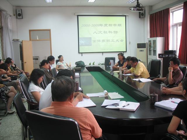 8月29日上午,人文及社會科學部在部會議室召開全體教職工大會。會議議程主要有兩項:首先四位部領導結合年度工作要點,根據分管工作分別進行本學期工作部署,第二項議程是教學觀摩及教學體會交流。胡新華主任在講話中首先對暑假各位堅守工作崗位的教職工表示衷心的感謝,希望全體教職工以滿腔熱情投入到新學期的教學和人才培養工作中,當前主要做好校慶55周年相關工作,各教研室和教工黨支部要繼續結合自身學科特點廣泛參與校園文化建設,營造良好的人文氛圍。全體教職工要以高度主人翁意識積極參與職工之家的建設、積極獻計獻策配合部領導班子進一步做好人事分配制度改革。丁英宏、李衛紅副主任和肖中瓊書記分別從本科教學、研究生人才培養和黨建思想政治工作等方面強調本學期工作重點。