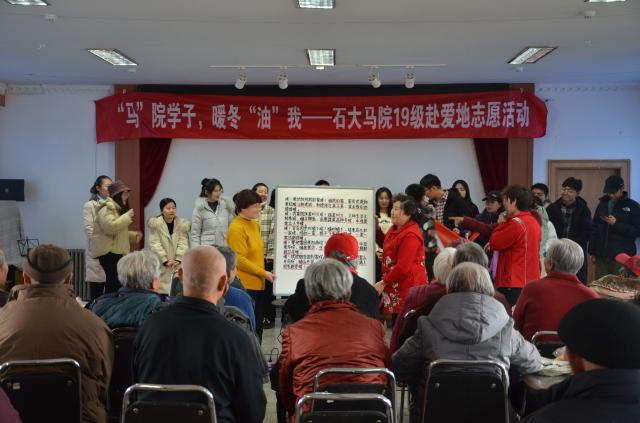 為引導(dǎo)學(xué)生在服務(wù)中受教育、長才干、做貢獻,以實際行動踐行初心使命,發(fā)揚志愿精神, 12月17日,中石大馬克思主義學(xué)院組織研19級全體同學(xué)前往昌平區(qū)愛地老人頤養(yǎng)中心開展“馬院學(xué)子,暖冬‘油’我”志愿服務(wù)活動。同學(xué)們表演了“男神來了”“當(dāng)愛在靠近”“石油工人心向黨”等文藝節(jié)目,獲得老人們的一致好評,全場掌聲迭起、歡笑不斷。老人們分享了自己年輕時建設(shè)祖國的經(jīng)歷,并表達了對同學(xué)們的殷切期盼。