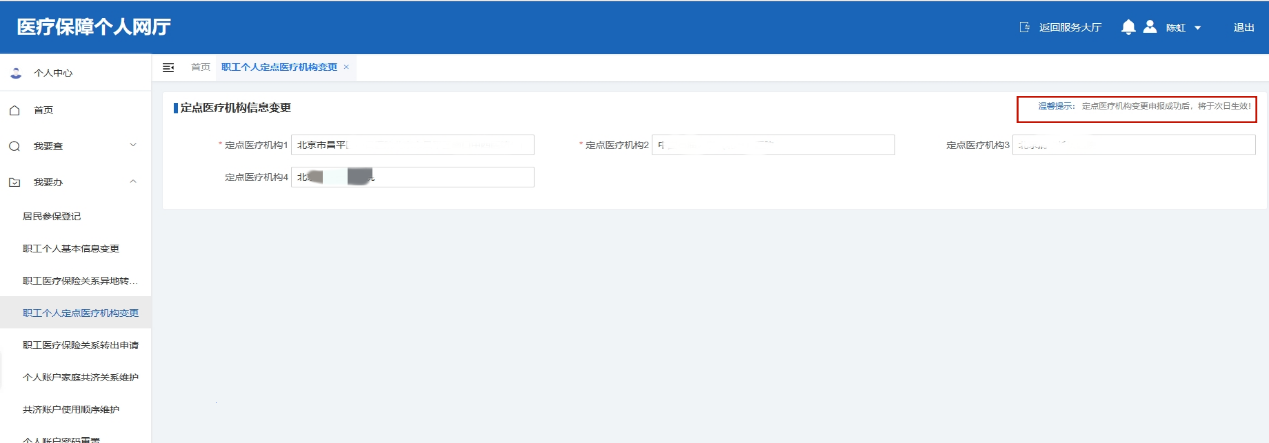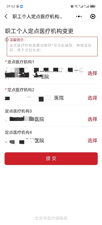 5.進入后搜索醫院,點擊“選擇”后變更,系統提示申報成功,次日生效。