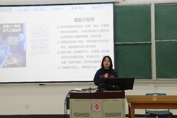 化學工程與環境學院2023級博士研究生邵凡、新能源與材料學院2021級本科生張田慧、非常規油氣科學技術研究院2021級研究生王瑋圍繞賽前報名、項目選題、如何組隊、商業計劃書撰寫、PPT制作、路演匯報等方面分別做分享。