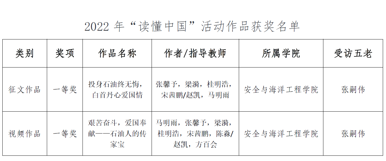 近日,中國石油大學(北京)關心下一代工作委員會公布了2022年“讀懂中國”活動評審結果,安全學院報送的采訪張嗣偉教授兩份作品:征文《投身石油終無悔,白首丹心愛國情》、微視頻《艱苦奮斗,愛國奉獻——石油人的傳家寶》均獲校級一等獎。