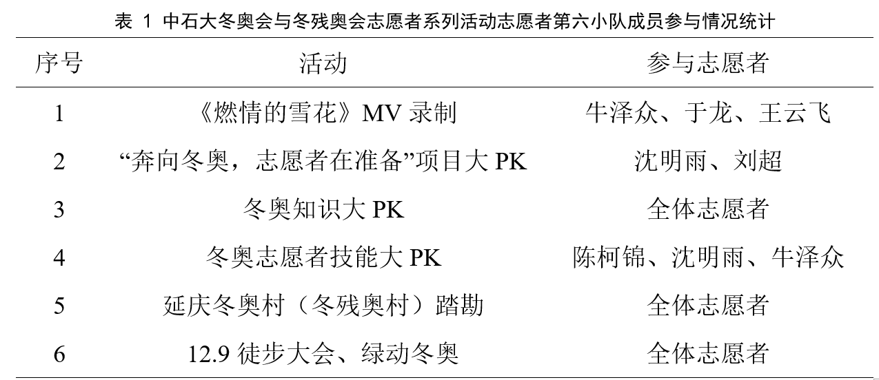 冬奧志愿第六小隊牢記初心使命,踐行志愿者精神,發揚艱苦奮斗作風,保時、保質、保量完成冬奧志愿者培訓要求,努力成為一支有能力、有擔當、有溫度的志愿者隊伍。2021年秋季學期,中石大冬奧會與冬殘奧會志愿者系列活動我小隊成員參與情況統計見表格。