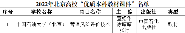 近日,北京市教育委員會公布2022年北京高?!皟?yōu)質(zhì)本科課程”“優(yōu)質(zhì)本科教材課件”“優(yōu)秀教學(xué)管理人員”“優(yōu)秀本科實(shí)驗(yàn)教學(xué)指導(dǎo)教師”“本科教學(xué)改革創(chuàng)新項(xiàng)目”等獎項(xiàng)和項(xiàng)目的評審結(jié)果。我院海洋油氣工程系楊進(jìn)教授獲評北京高?!皟?yōu)秀教學(xué)管理人員”,安全工程系董紹華教授、徐晴晴老師主編的《管道風(fēng)險評價技術(shù)》獲評北京高校“優(yōu)質(zhì)本科教材課件”。