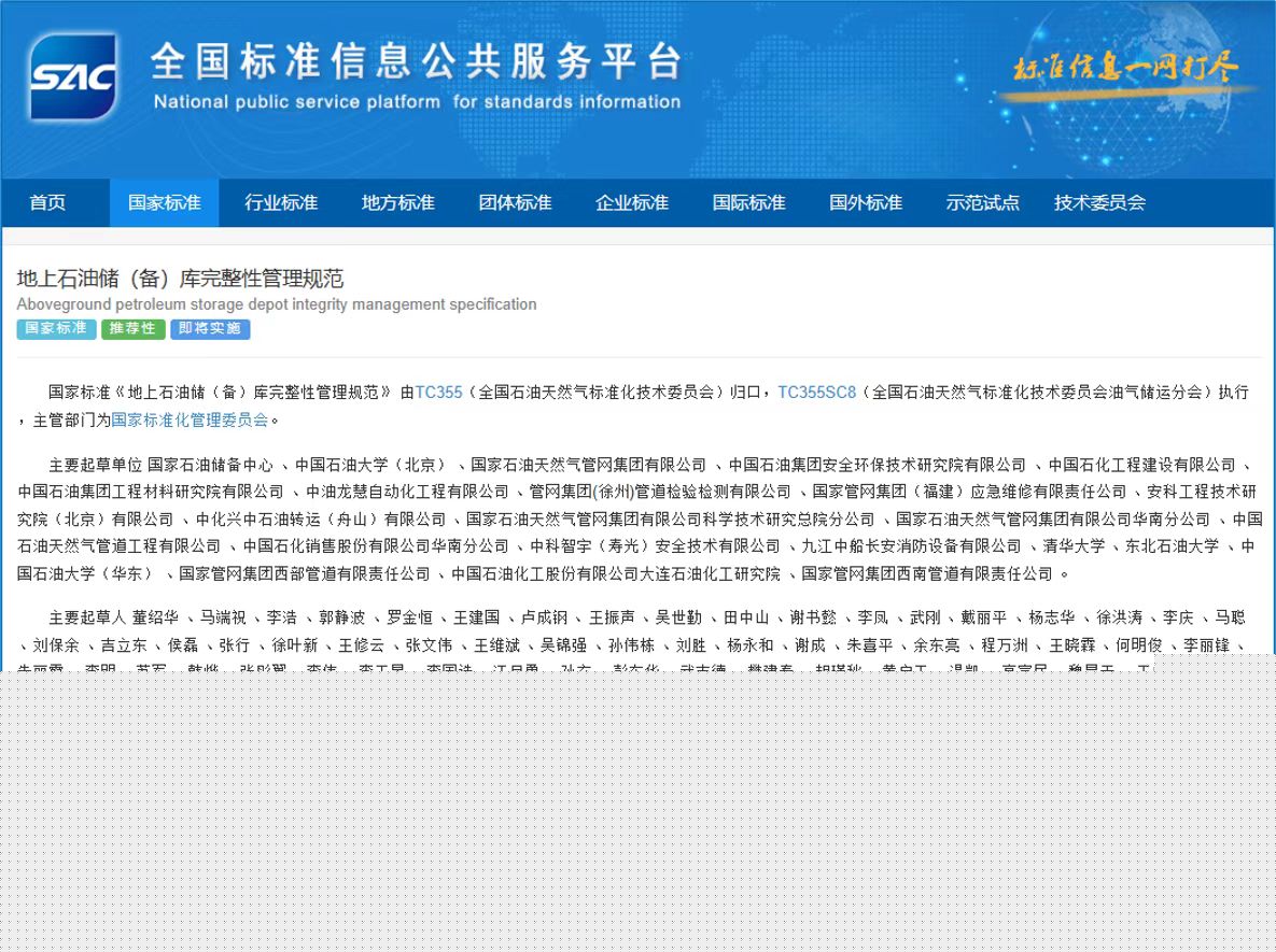 該標準針對我國大型石油儲(備)庫安全風險高、運行難度大,儲(備)庫完整性管理缺乏統一的國家標準現狀,編制組經多年深入研究,提出了地上石油儲(備)庫完整性管理的內容、方法和要求,包括建設期完整性管理、數據采集與整合、風險評價、完整性檢測、完整性評價、風險削減與設備設施維修維護、效能評價、應急管理、一體化風險管控平臺等要求,適用于地上石油儲(備)庫儲罐、工藝管道、控制系統、附屬設施等資產的完整性管理,以及地上石油儲(備)庫的安全與應急管理。本標準的發布將大幅提升我國石油儲(備)庫本質安全、風險管控水平,對于推動國家戰略儲備庫的安全運行具有重要意義。