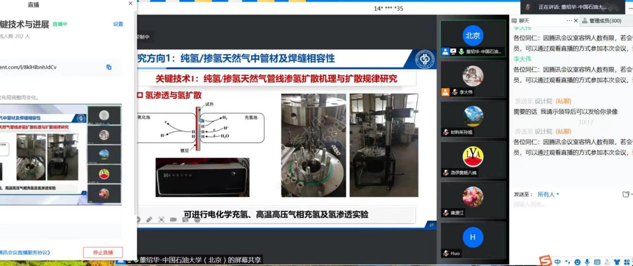 為普及長輸管道摻氫/純氫輸送安全領域的新技術,促進行業交流和發展,7月8日上午,中國石油大學(北京)管道技術與安全研究中心主任、安全與海洋工程學院教授董紹華受中國特種設備安全與節能促進會邀請,采用線上直播的方式作了題為《氫能輸送安全關鍵技術與進展》的報告,介紹了氫能輸送研究領域最新成果、關鍵技術與進展,并就相關技術和與會人員展開研討。線上,近百家單位共千余人參與了此次主題報告的直播。