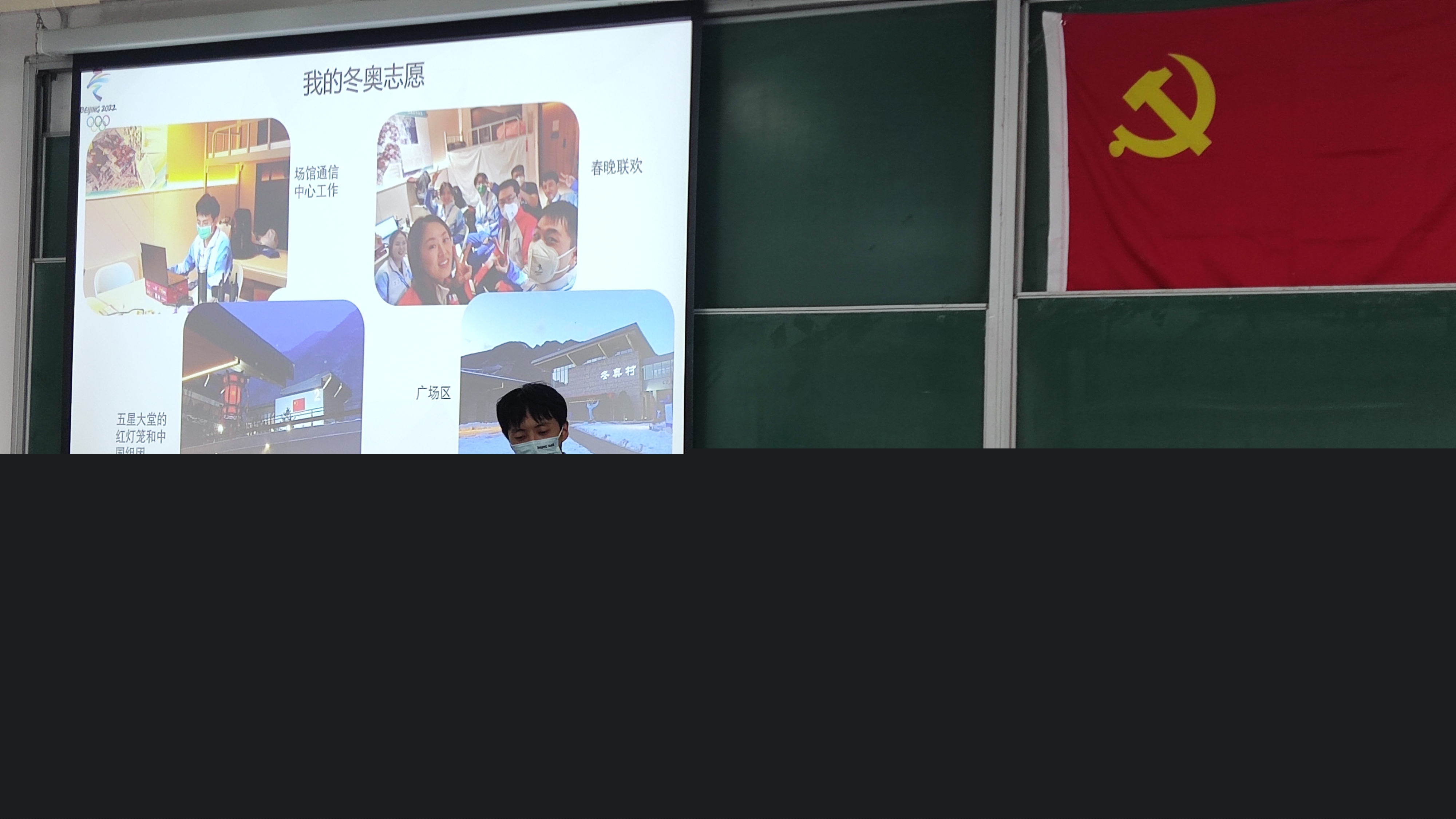 本安全第一黨支部書記馬明雨介紹黨日活動開展的背景。于龍同志以一名冬奧會志愿者的身份從個人參與志愿者動機、冬奧會志愿服務經歷以及個人感受來講述在冬奧會志愿期間的所感所想;沈明雨同志從志愿者歷程和工作內容及志愿感受講述了其在志愿者服務中的暖心瞬間、個人對于志愿者工作的所思所想,并呼吁全體黨員應參與到志愿服務的大家庭之中;馬明雨同志以“從再相逢故事中見證民族復興”為主題,從其個人的特殊成長經歷開始講述,為同學們展示了在延慶冬奧村見證的國家在發展中逐步走向富強的真實縮影。