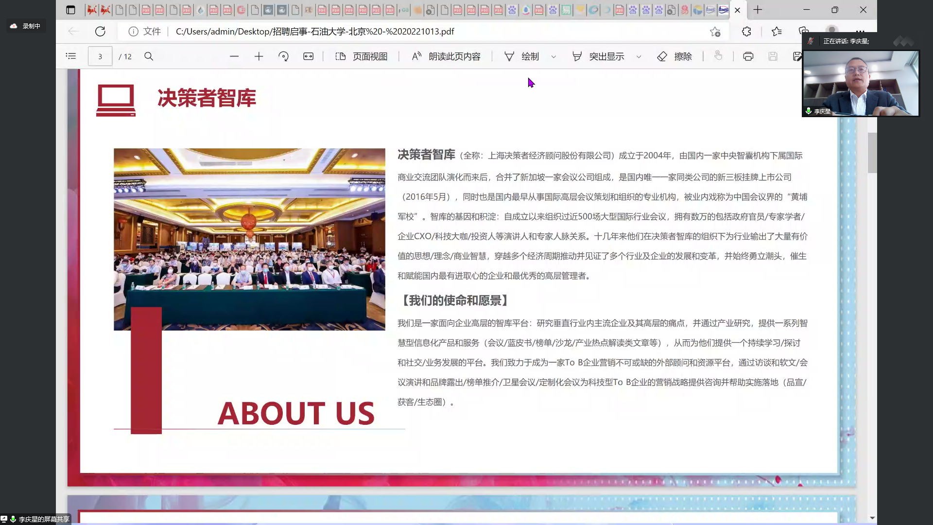 李慶星從企業規模、主營業務、使命愿景三個方面介紹了公司基本情況,為大家展示了公司與海洋油氣和海洋工程相關的系列品牌會議,詳細介紹了本次招聘的崗位要求及薪資待遇。李慶星與人力資源部門負責人共同就簡歷投遞方式、基本能力要求、工作保障、職業發展等同學們關心的問題進行了解答。