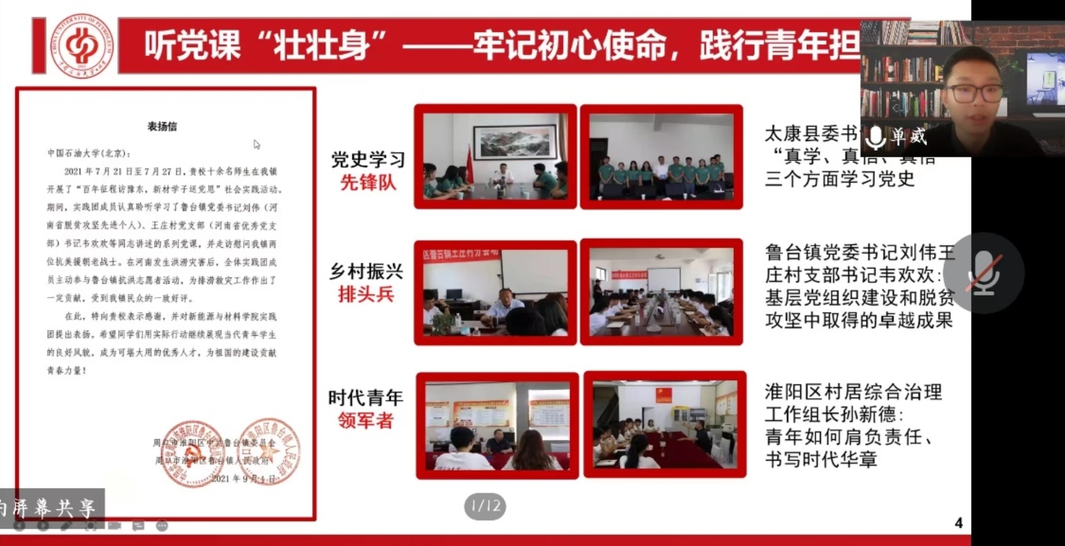 首先,由2021年全國大中專學生志愿者暑期“三下鄉”優秀團隊成員單威同學進行社會實踐經驗分享,他主要從社會實踐的選題、活動開展的形式、團隊合作、實踐總結、成果宣傳等方面進行了分享,并以視頻的形式展示了“百年征程訪豫東,新材學子頌黨恩”社會實踐團隊的成果。