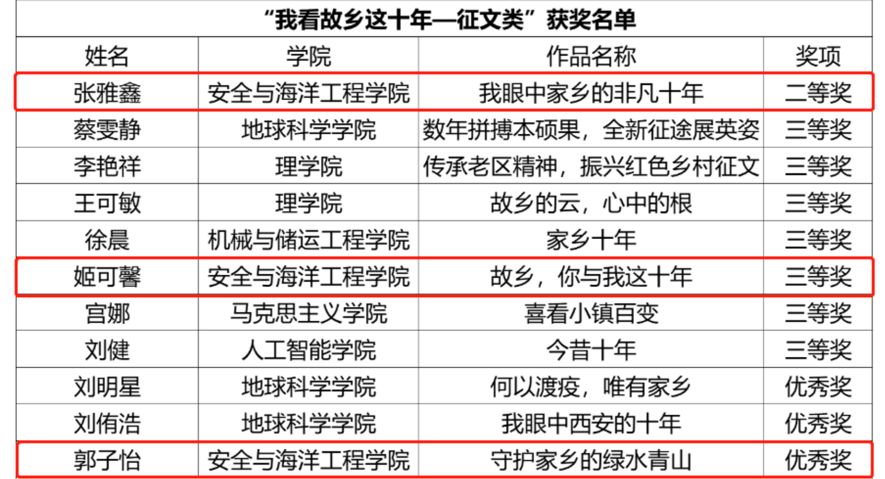 安全工程專業21級本科生張雅鑫、姬可馨、郭子怡分別獲“我看故鄉這十年-征文類”項目作品征集比賽二等獎、三等獎、優秀獎。