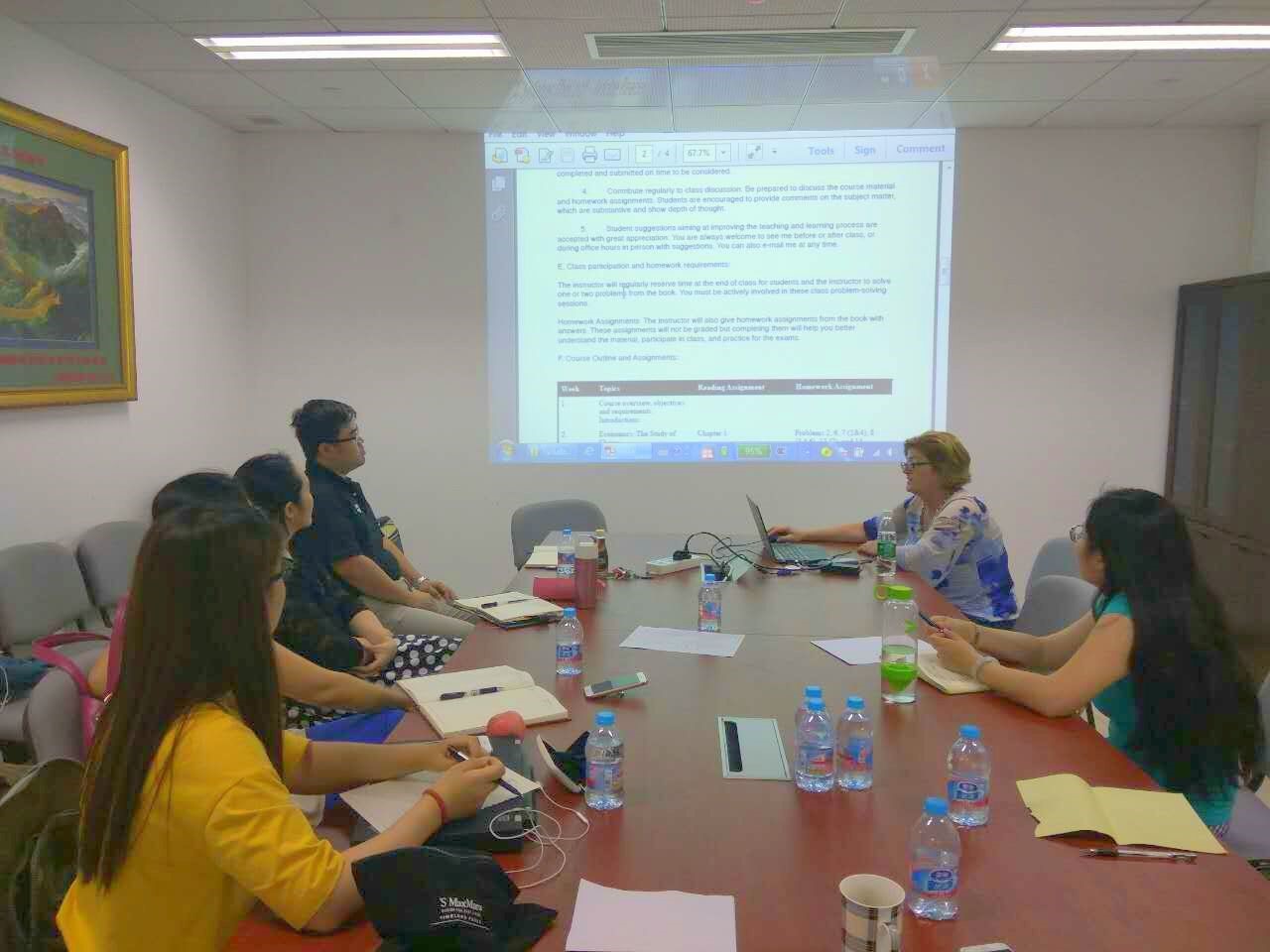 2017年6月2日,工商管理學(xué)院召開第三次全英文教學(xué)團(tuán)隊(duì)討論會(huì)。本次討論會(huì)由Monica Thiel博士向大家介紹美國(guó)的課程體系,以本科課程《經(jīng)濟(jì)學(xué)原理》為例,向大家展示英文教學(xué)大綱、教材、教學(xué)幻燈片的樣例。
