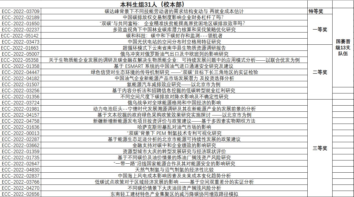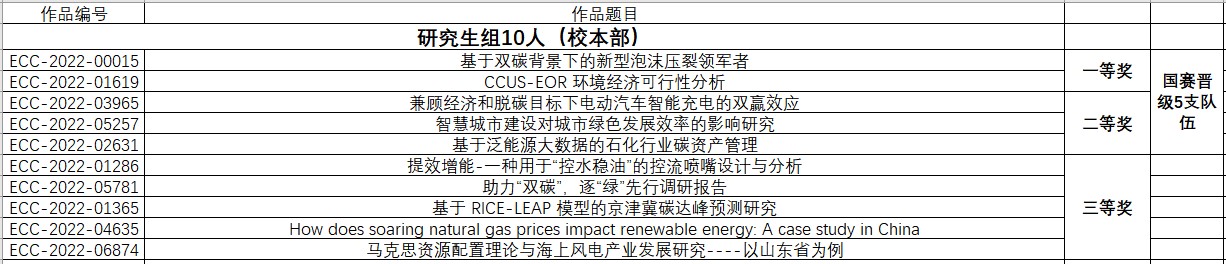 2022年4月10日,第8屆能源經濟學術創意大賽18賽區比賽落下帷幕(18賽區包括中國石油大學(北京)校本部及克拉瑪依校區)。18賽區比賽總成績由初賽成績及答辯成績構成。18賽區比賽共評出特等獎2名,校本部和克拉瑪依校區各1名;一等獎9名,校本部研究生2名、本科生5名、克拉瑪依校區2名;二等獎18名,校本部研究生3名,本科生9名,克拉瑪依校區6名;三等獎31名,校本部研究生5名、本科生16名、克拉瑪依校區10名。校本部推薦18支隊伍、克拉瑪依校區推薦8支隊伍角逐國賽獎項。18賽區獲獎團隊和晉級國賽的團隊如下。