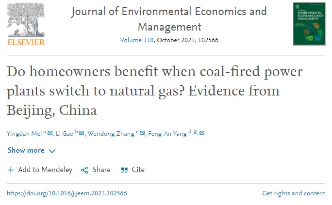 近日,中國石油大學(xué)(北京)經(jīng)濟(jì)管理學(xué)院梅應(yīng)丹副教授、高立副教授與美國愛荷華州立大學(xué)Wendong Zhang副教授、臺灣大學(xué)Feng-an Yang助理教授合作的論文“Do homeowners benefit when coal-fired power plants switch to natural gas? Evidence from Beijing, China(房屋購買者視角下火電廠“煤改氣”政策的環(huán)境經(jīng)濟(jì)效益評估)”在資源環(huán)境經(jīng)濟(jì)學(xué)頂級國際期刊Journal of Environmental Economics and Management在線發(fā)表。JEEM創(chuàng)刊于1974年,是環(huán)境和資源經(jīng)濟(jì)學(xué)領(lǐng)域公認(rèn)的頂級學(xué)術(shù)期刊,致力于發(fā)表這一領(lǐng)域頂尖水平的理論和實證文章。自創(chuàng)刊以來,以我國大陸高校或科研機(jī)構(gòu)為第一作者單位在該刊上發(fā)表的學(xué)術(shù)論文不超過25篇。