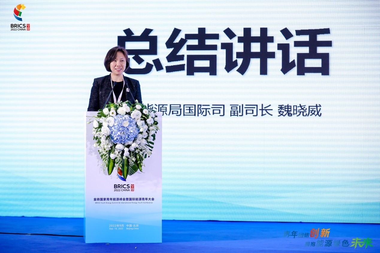 國家能源局國際司副司長魏曉威作總結講話。她代表主辦單位國家能源局,對各有關單位的大力支持和積極參與表示感謝,對中國石油大學作為中國能源學科領域領軍高校之一的責任擔當和世界眼光表示肯定。她指出,此次峰會促進了能源合作與高校教育的融合發展,加強了金磚國家青年的學術合作、聯合實踐活動,打開了金磚國家及其他國家青年能源合作的友誼之門。