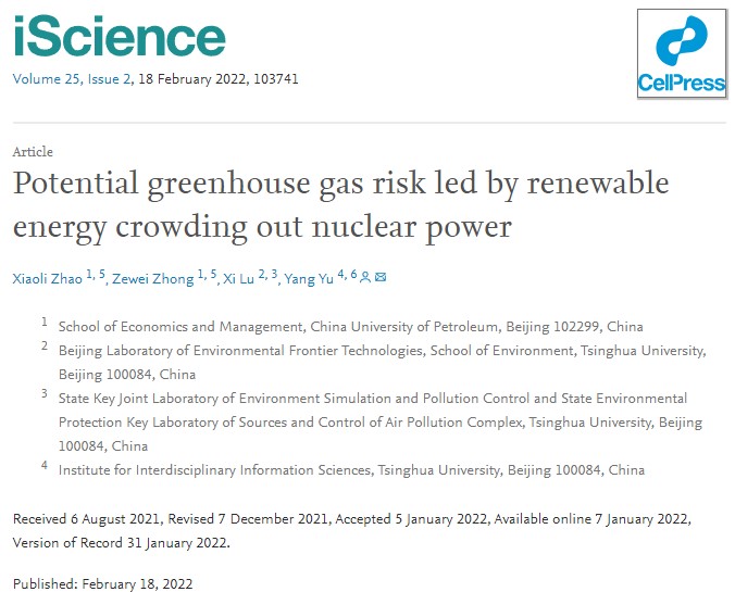 近日,中國石油大學(北京)經濟管理學院趙曉麗教授、博士研究生鐘澤偉與清華大學魯璽副教授、清華大學于洋助理教授合作的論文“Potential greenhouse gas risk led by renewable energy crowding out nuclear power(可再生能源擠出核電導致的潛在溫室氣體排放風險)”在iScience期刊發表。iScience是國際著名Cell Press出版社旗下的開放獲取期刊,該期刊涵蓋了生命、物理及環境科學領域的基礎和跨學科領域的應用研究,收錄了領域內最前沿的優秀論文。