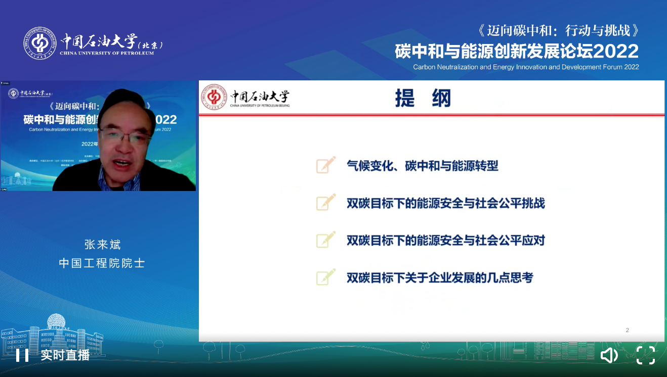 中國工程院院士、中國工程院原副院長、中國工程物理研究院高級科學顧問、應用物理、強激光技術和能源戰略專家杜祥琬,中國工程院院士、石油地質學與勘探著名專家、教授級高級工程師、中國工程院能源與礦業工程學部副主任趙文智,中國工程院院士、中國石油大學(北京)教授、應急管理部油氣生產安全與應急技術重點實驗室主任、國務院第八屆安全科學與工程學科評議組召集人、全國政協常委張來斌,中國社會科學院學部委員、中國社科院大學教授、中國城市經濟學會會長、中國生態文明研究與促進會副會長、國家氣候變化專家委員會委員潘家華,中國海油集團能源經濟研究院黨委書記、院長、教育部哲學社會科學研究重大課題攻關項目首席專家王震,北京航空航天大學經濟管理學院院長、國家基金創新研究群體學術帶頭人、國家杰出青年科學基金資助獲得者、教育部長江學者特聘教授范英,中國社會科學院工業經濟研究所所長、二級研究員、《中國工業經濟》和《經濟管理》主編、中國工業經濟學會理事長、中國區域經濟學會會長史丹,中國石油大學(北京)經濟管理學院名譽院長、中國科學院數學與系統科學研究院研究員、中國系統工程學會理事長、《系統工程理論與實踐》和《系統科學與數學》主編楊曉光,中國石油大學(北京)校長吳小林出席論壇。來自多所高校和研究機構的專家學者、企業界人士、社會公眾等參加線上論壇。