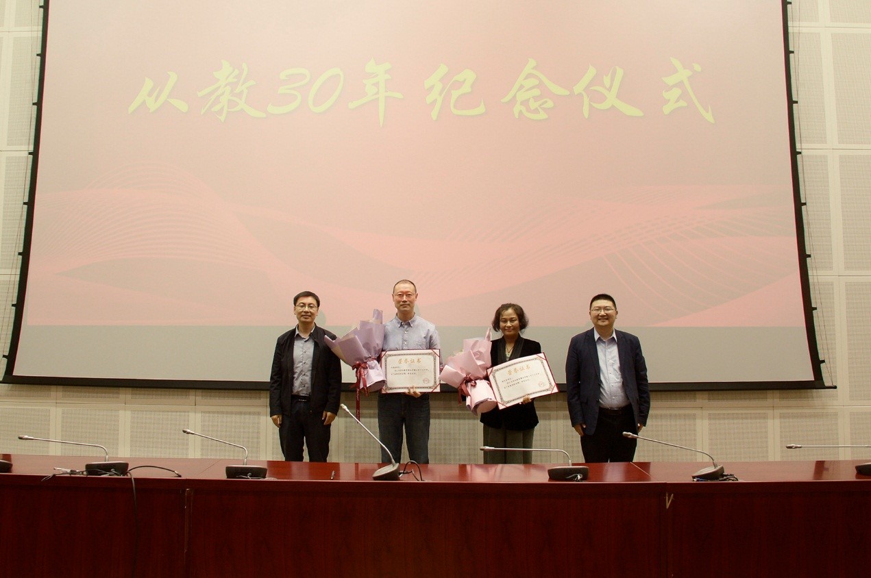 朱義清為從教30周年的牛琦彬和楊久香教師頒發榮譽證書并獻花。他希望全體教職工向兩位老師學習,認真貫徹黨的教育方針,弘揚兩位老師的奉獻精神,不斷提高教學、科研水平,為推進學院持續發展作出更大貢獻。