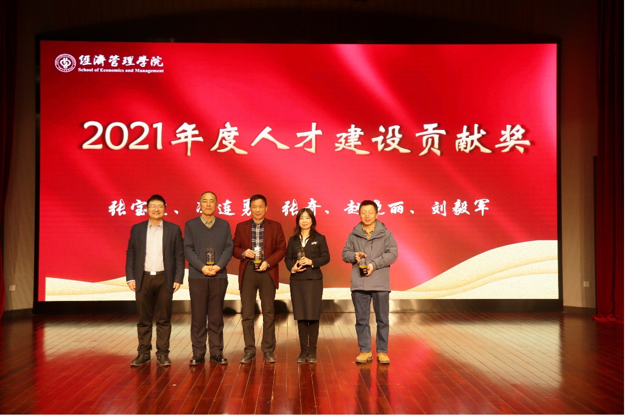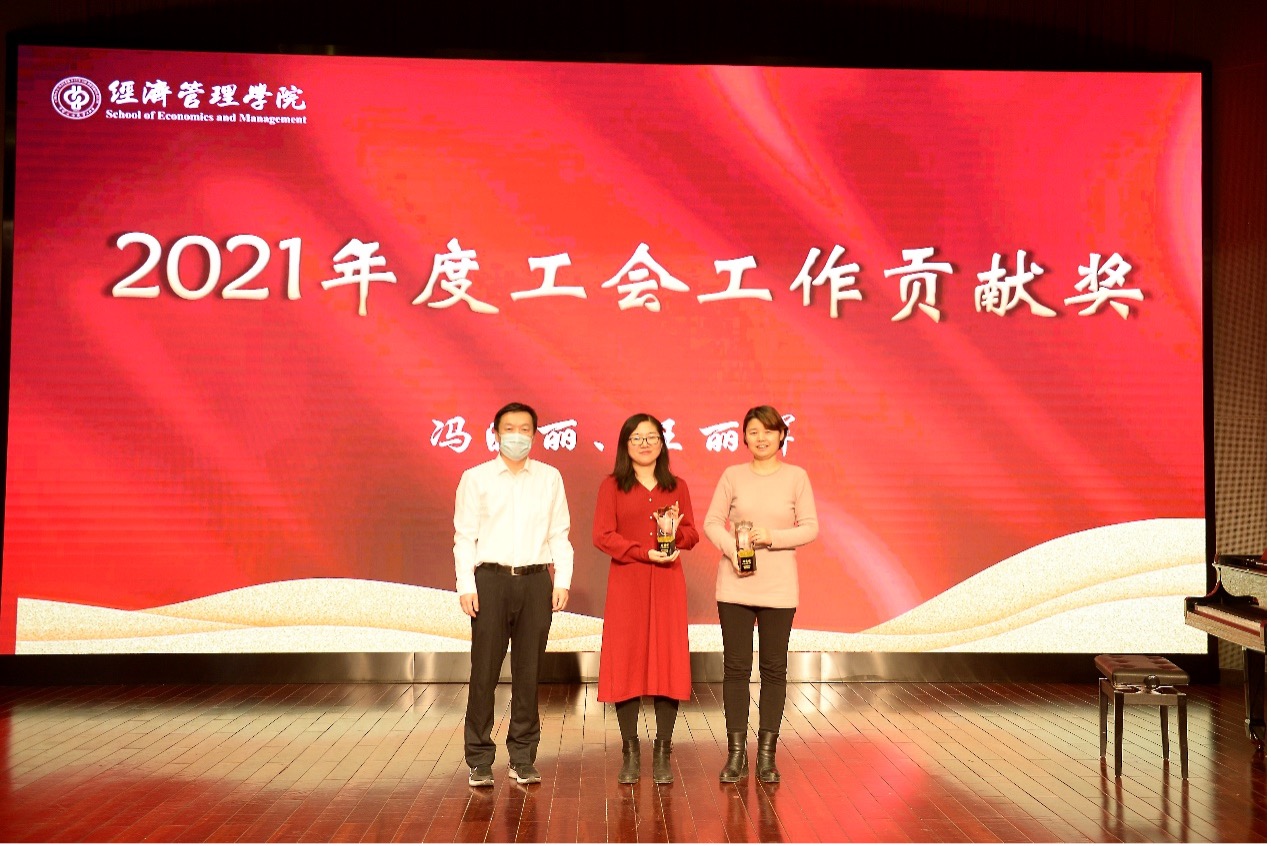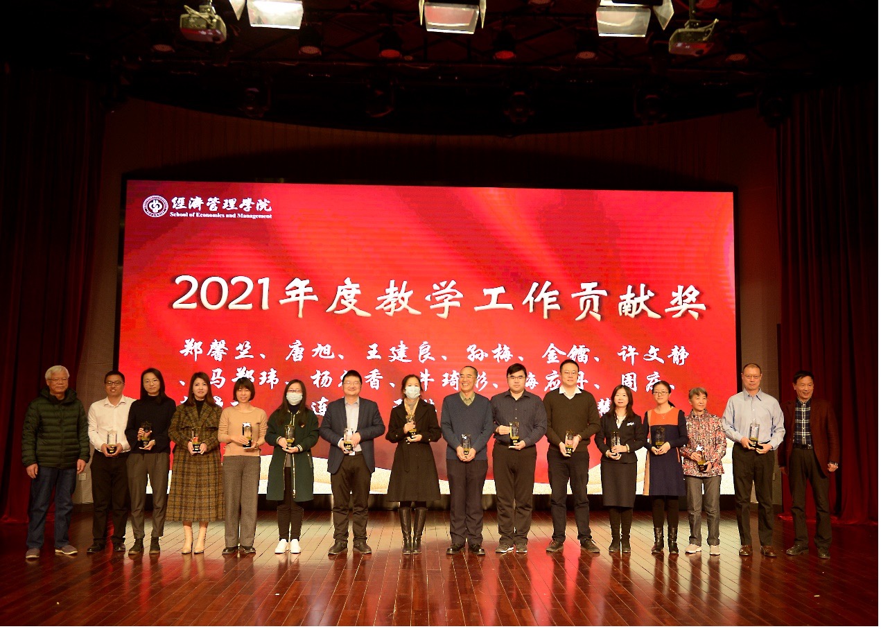 朱義清宣讀了關于表彰2021年度經濟管理學院各項工作突出貢獻獎和貢獻獎獲得者的決定,對在黨建、科研、教學、人才、公共服務、學生工作、工會工作等作出突出貢獻和在院內教學比賽中獲獎的老師進行表彰并頒發了獎杯和證書,激勵全院教職工以先進為榜樣,積極進取,開拓創新。