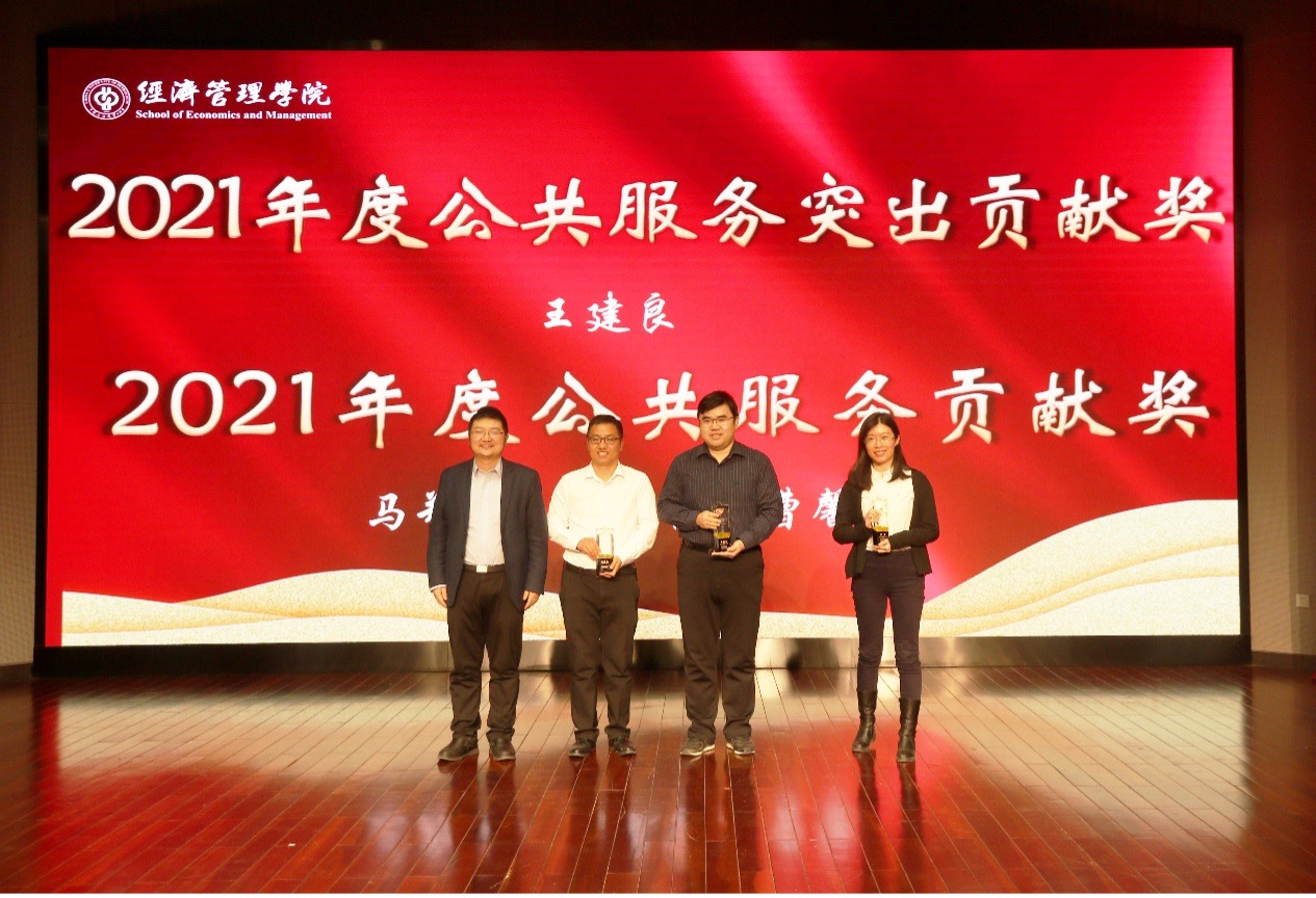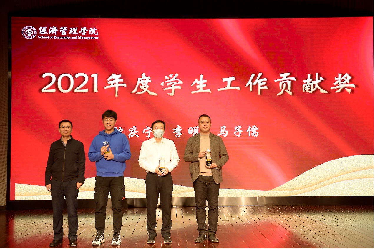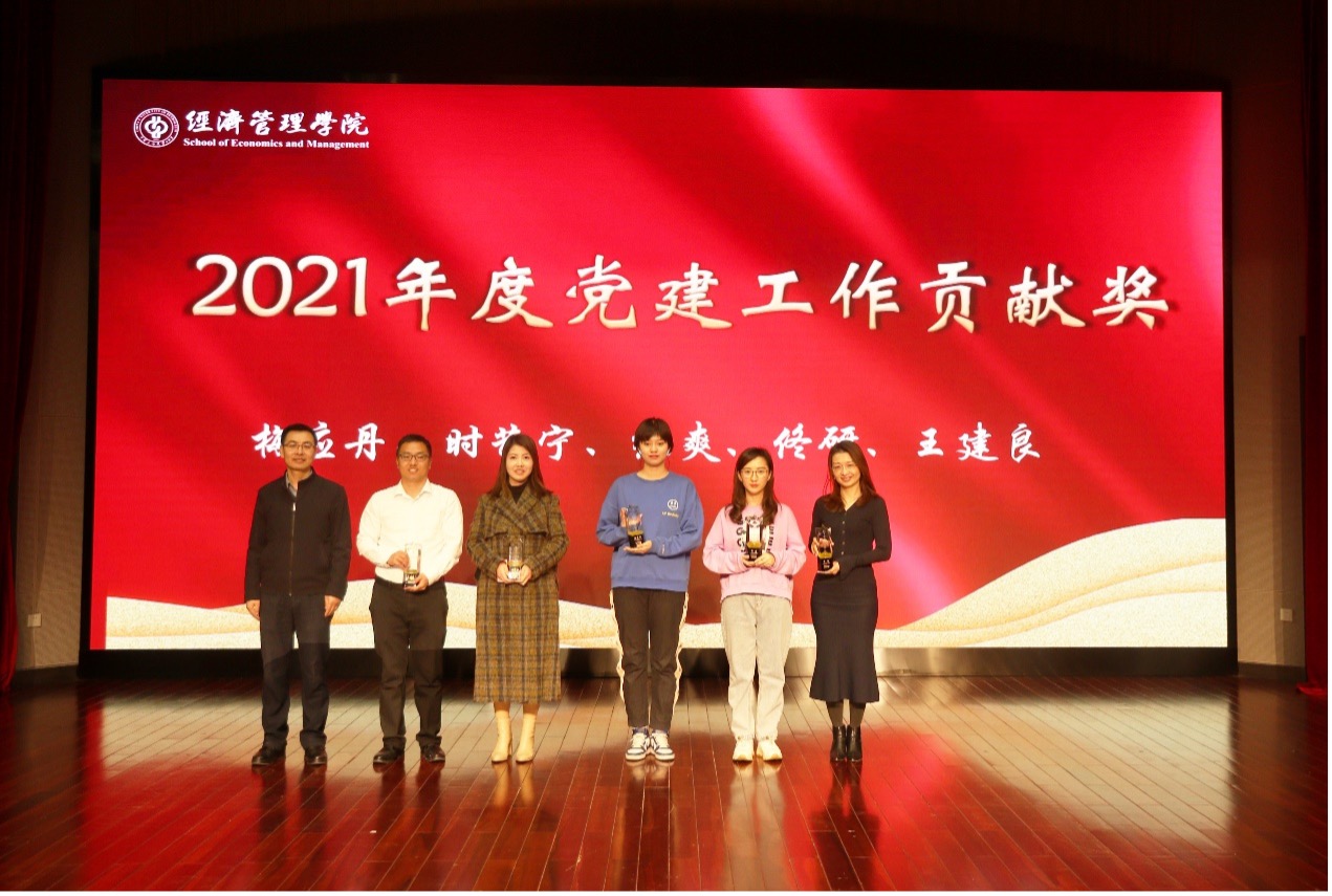 朱義清宣讀了關于表彰2021年度經濟管理學院各項工作突出貢獻獎和貢獻獎獲得者的決定,對在黨建、科研、教學、人才、公共服務、學生工作、工會工作等作出突出貢獻和在院內教學比賽中獲獎的老師進行表彰并頒發了獎杯和證書,激勵全院教職工以先進為榜樣,積極進取,開拓創新。