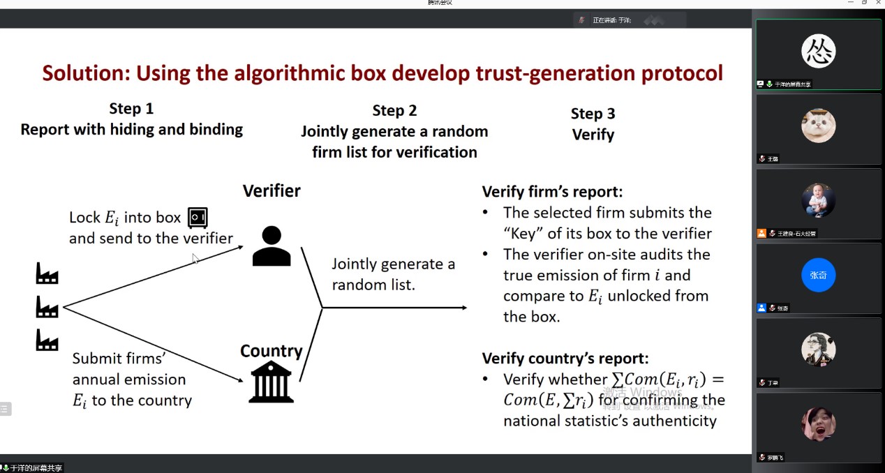 清華大學(xué)交叉信息研究院的于洋就“能源系統(tǒng)的數(shù)據(jù)質(zhì)量與價值”這一主題進(jìn)行了演講匯報。于教授在報告中分享了他們團(tuán)隊將密碼學(xué)應(yīng)用到碳核查、碳管理上的相關(guān)成果,通過構(gòu)建的密碼系統(tǒng)將碳核查者和國家之間的互信問題轉(zhuǎn)化為數(shù)學(xué)上獲得真正隨機(jī)數(shù)的問題從而解決碳核查的能源數(shù)據(jù)安全問題。