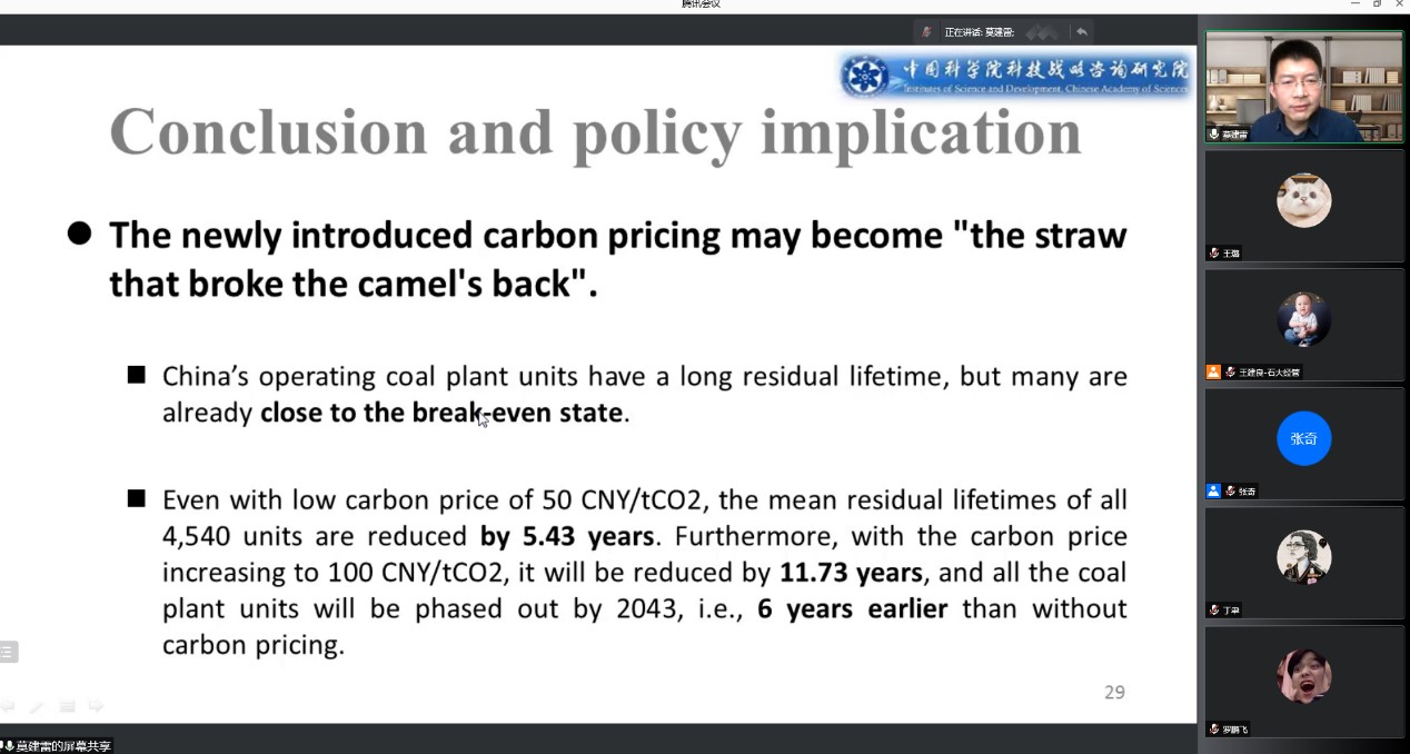 中國科學(xué)院科技戰(zhàn)略咨詢研究院的莫建雷分享題為“全國碳定價與化石能源資產(chǎn)擱淺風(fēng)險”的研究。該研究以多因素考慮石油資源擱淺風(fēng)險,并給出了碳定價的引入對火電機(jī)組、煤電機(jī)組影響結(jié)果分析,以及全國29個省份之間的異質(zhì)性分析。