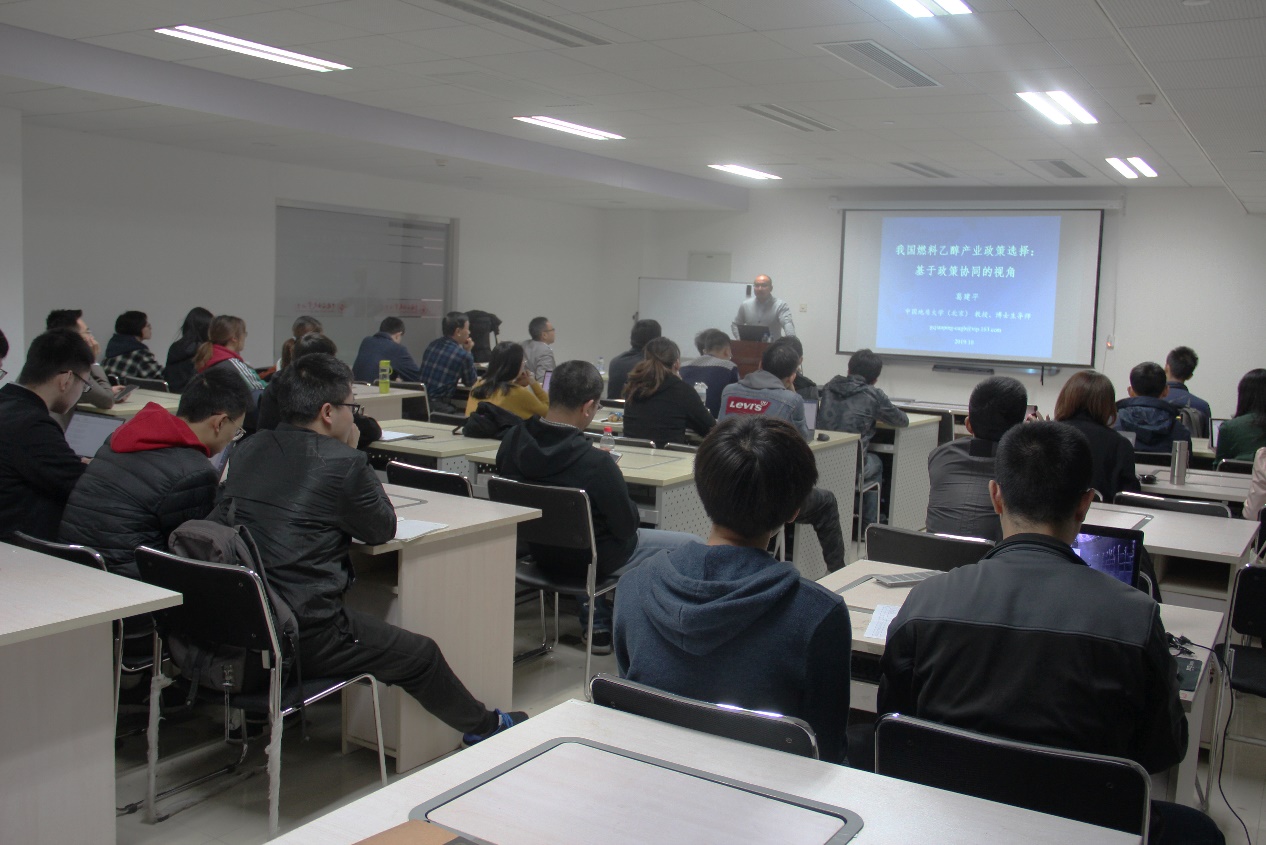 葛建平教授首先從政策外部性理論入手,對其研究中所涉及的政策外部性進行了界定;之后從對燃料乙醇產業發展現狀分析中指出了政策協同研究的重要性與迫切性;最后分別從單一政策效果與協同政策效果的對比闡明了多目標協同政策的優勢。葛建平教授的研究不僅可以直接支撐燃料乙醇產業的政策設計,也對其他可再生能源政策的制定提供思路。講座后,葛建平教授與師生進行了熱烈討論。