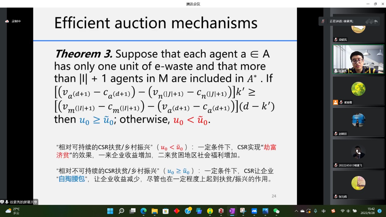 9月28日,經濟管理學院“雙周論壇”第二十二期在線上舉行,應經學院邀請,北京理工大學管理與經濟學院教授、特立青年學者徐素秀老師以最新研究 “Auction-based e-waste recycling with dual responsibilities”為主題開展了講座。此次報告由企業管理系系主任禹春霞老師主持,經濟管理學院副院長趙曉麗老師及院內外一百多位師生在線參加了講座。參會師生與徐老師就講座內容展開了熱烈討論,本次講座取得了很好的反響。