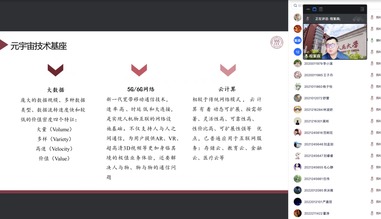 報告結束后,李明教授對報告內容進行了總結,參會師生與程教授就元宇宙在制造業中的應用、元宇宙相關學科建設和課程設置、元宇宙在組織行為等領域的應用等問題展開了熱烈的對話和探討。程教授在回答提問時指出,元宇宙所涉及的研究內容和領域十分豐富。當前包括中國人民大學等高校已經開展了元宇宙系列課程,能夠將元宇宙與數字經濟、電子商務、信息管理和信息系統等課程有機融合,豐富課程知識和內容,給學生以啟示。