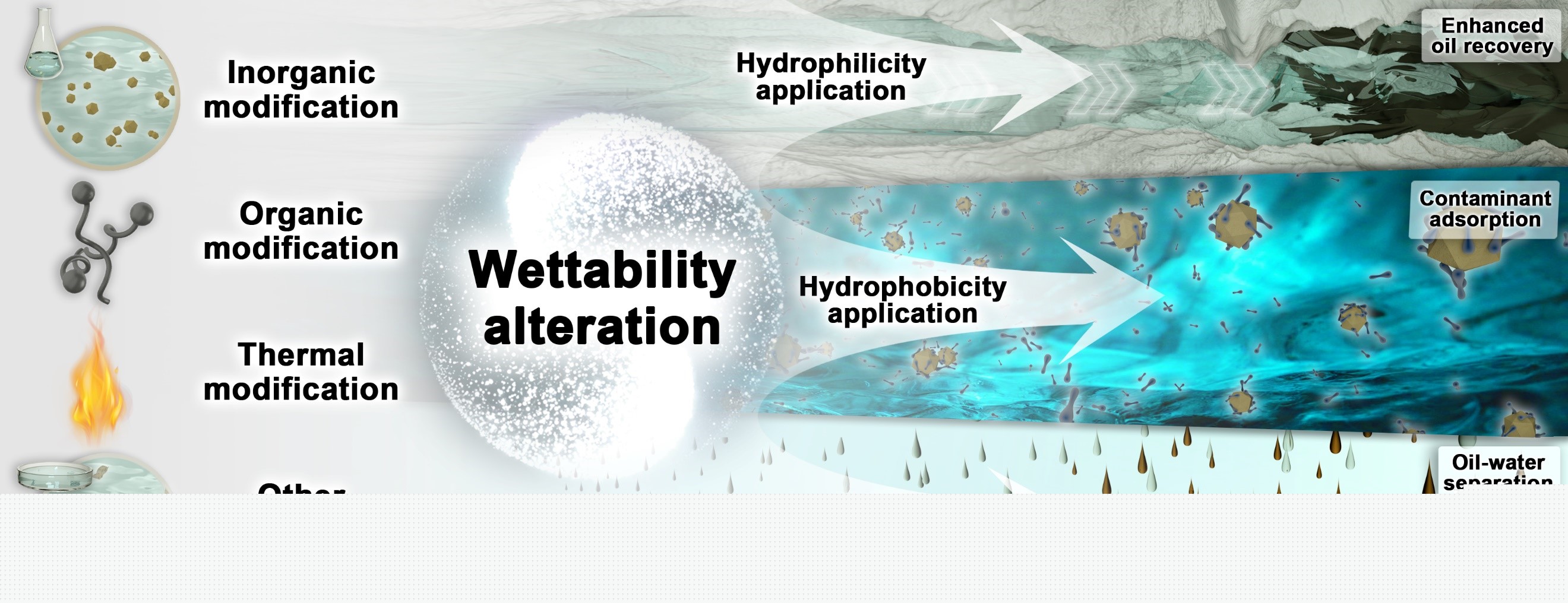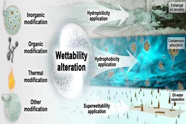 該論文聚焦于材料的孔隙潤濕性,總結(jié)了潤濕性的影響因素(溫度、基體的類型和層電荷、改性劑的種類和結(jié)構(gòu))、測定方法(接觸角法和比值法)及其調(diào)變方法(無機(jī)、有機(jī)和熱改性等),概述了不同潤濕類型在提高采收率、污染物吸附和油水分離中的應(yīng)用概況,闡明了其作用機(jī)理,歸納了潤濕性在提高采收率、污染物吸附和油水分離等領(lǐng)域存在的應(yīng)用問題和挑戰(zhàn)并探討了未來的發(fā)展趨勢。為設(shè)計(jì)開發(fā)驅(qū)油劑、吸附劑以及油水分離材料等新材料提供理論基礎(chǔ),并有望應(yīng)用于環(huán)境保護(hù)、粘土礦物、吸附技術(shù)、油田開發(fā)、納米技術(shù)、界面科學(xué)和環(huán)境催化等諸多領(lǐng)域。