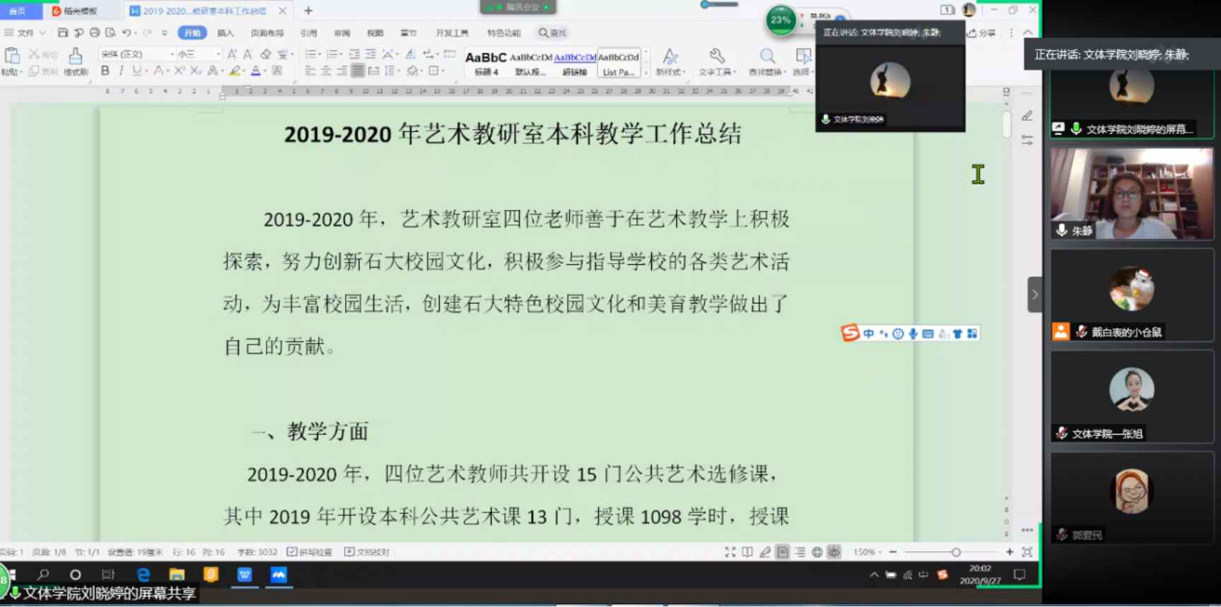 2020年9月27日,體育與人文藝術學院線上召開了2019-2020學年本科教學質量分析報告會,會議由學院教學副院長朱靜主持,文體學院全體教職工參加了會議。